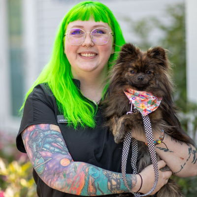 Celine grew up in Portland and has loved animals from the start. She studied psychology at SMCC before deciding to pursue her love of working with animals full time. She started out at the Animal Refuge League as a Veterinarian Assistant in 2014 and then began working in general practice as a full-time Veterinarian Technician in 2018.
